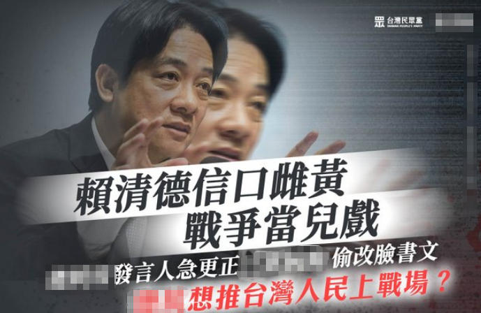 臺(tái)灣民眾黨批評(píng)賴清德推人民上戰(zhàn)場(chǎng)。(圖片取自網(wǎng)絡(luò))