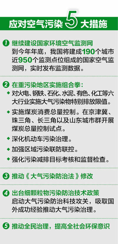 15日下午,十二屆全國人大一次會議新聞中心舉行記者會,環境保護部副部長吳曉青等就“環境保護與生態文明建設”相關問題回答了記者提問。吳曉青表示,要突出重點地抓好重污染地區的大氣污染治理。必須針對重污染地區出重拳、用猛藥,而且還要打組合拳,加強治理。將在這些地區實施大氣污染物的特別排放限值等5大措施,并將京津冀、珠三角、長三角PM2.5納入考核目標。環保部將會同有關部門制定考核辦法,開展實施情況的監督考核,確保任務落實到位。